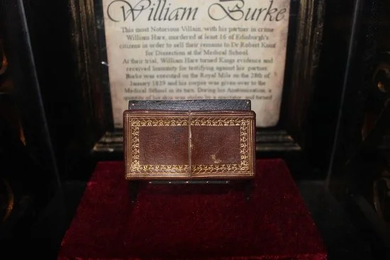 Wallet bound in William Burke’s skin in the Cadies & Witchery Tours exhibit on Victoria Street. The book bound in his skin, as well as the skeleton and the death mask, are in the Surgeons’ Hall Museum.