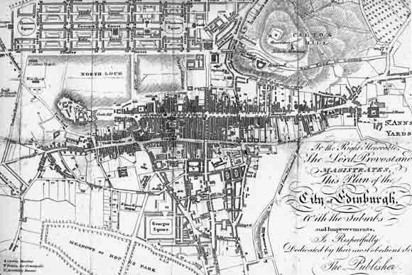 Plan of Edinburgh (1817) - the fishbone design of the Old Town with the Royal Mile in the middle, and the organised New Town at the top of the map. Notice how cramped the streets of the Old Town are in comparison to the New Town - no space to move, breathe or exist. It’s no wonder as soon as the New Town became an option, all the rich inhabitants moved down there, and the poor stayed behind, taking to living underground as a last resort.